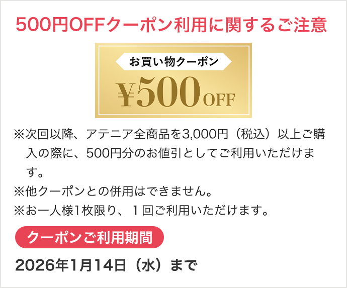 ※販売終了後に、ご注文ハガキ・FAX・インターネット・24時間自動受付でのご注文が到着した場合、「アテニア ポイントプログラム」、「アテニア プラスオン会員特典」、各種プレゼントキャンペーンの計算からは除かせていただきます。