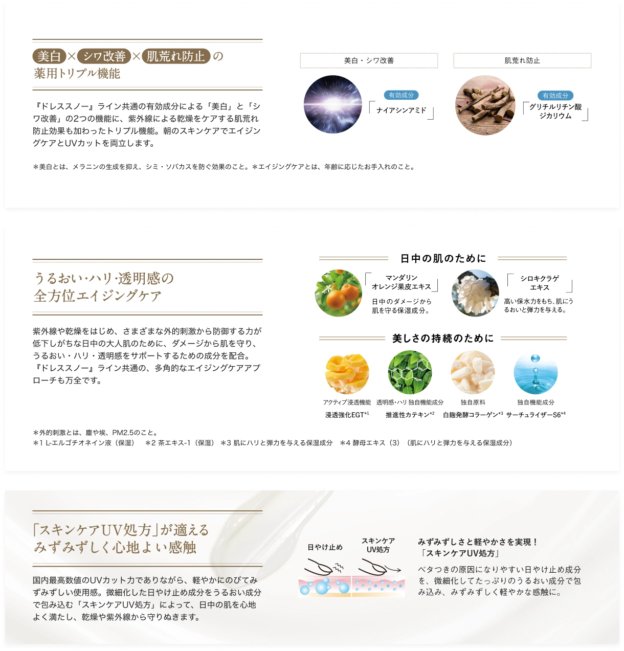 薬用美白・エイジングケアライン『ドレススノー』から待望のUV美容乳液が新登場。DRESS SNOW DAY PERFECT UV ドレススノーデイ・パーフェクトUV