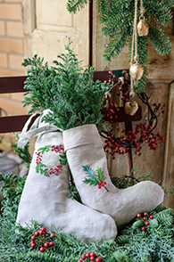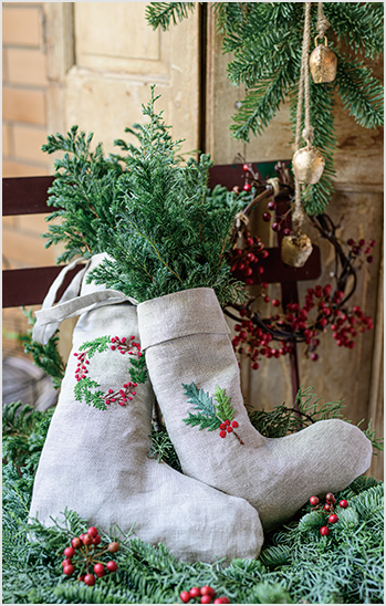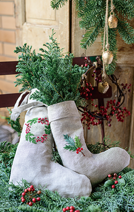 ナチュラルなリネンに丁寧な刺繍が施されているのは、友人のお母様が作ってくれた世界に一つだけのストッキング。モミの枝のグリーンと、サンキライの赤い実をあしらい、冬の森を思わせるナチュラルな彩りを添えました。