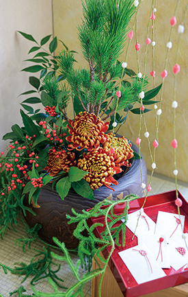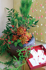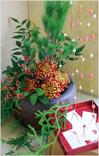 松や菊、千両といった祝い花とともに、新年の空間を華やかに彩ります。