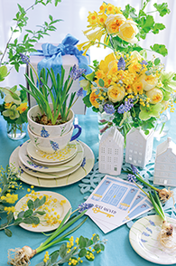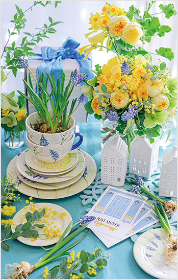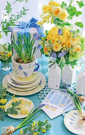ティーカップやお皿に添えて届けるのは、スイセン、ミモザ、バラの黄色い花たちと、春の訪れを告げるムスカリの球根。やわらかな陽射しに映えるブルーのテーブルクロスが、新しい暮らしの一日を明るく包みます。贈り物は、モノ以上に「気持ち」を運ぶもの。