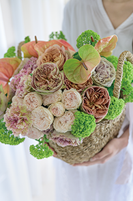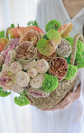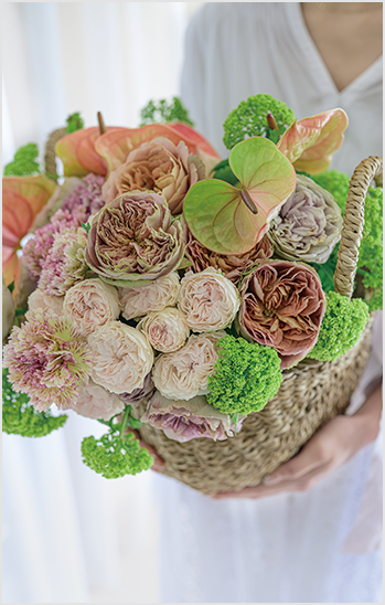 花が終わったあとも使えるナチュラルなバスケットに入れて、暮らしの中で長く楽しんでもらえるように仕立てました。お母さんに「ありがとう」の気持ちがしっかり届きますように。