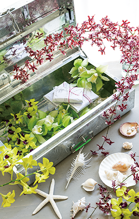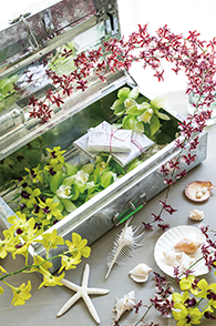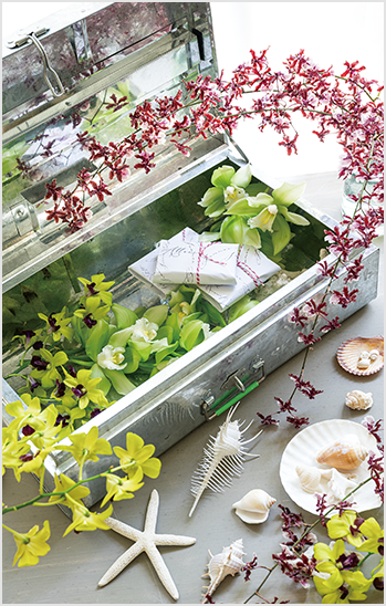 旅のワクワクを詰め込んだような、トランク型の金属ボックスに、南国の風を感じるオーキッドの花と、小さな貝殻を添えて。夏休みの思い出をそっと閉じ込めた、心のこもったサマーギフトです。