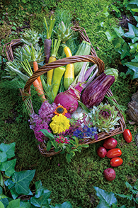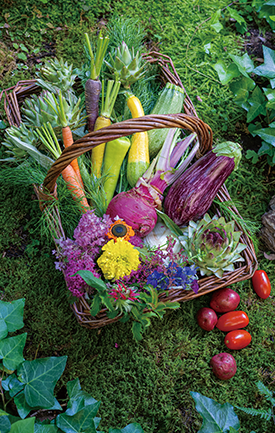 鮮やかなストライプ模様が美しいナス、存在感のあるアーティチョークの花、瑞々しいズッキーニとトマト、そして香り豊かなフェンネルやハーブが織りなす夏の彩り。