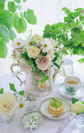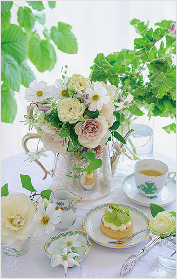 長い時を経て輝きを増す銀器と、今を咲く花々が織りなす、静かで豊かな時間。マスカットのタルトを添えたティータイムは、過ぎてきた日々をゆっくり振り返るようなひとときに。