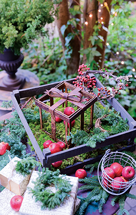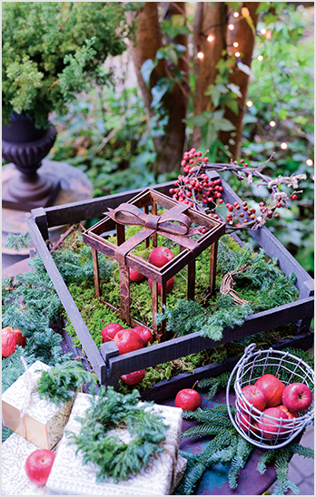 錆びたアイアンのギフトボックス型オーナメントをテーブルに飾り、グリーンの苔と赤いリンゴで彩りました。