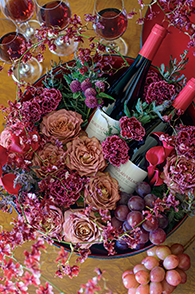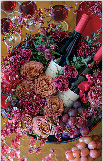 今回の贈りものは、旅先のミラノで見つけた丸い帽子用のボックスに、赤ワインのように深く華やかな色合いのカーネーション「ノビオバーガンディー」とボジョレーヌーボーのワインをあしらいました。