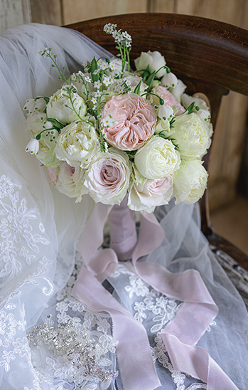 ブーケには繊細なウエディングベールと、やわらかなシルクのリボンを添えて、特別な一日を彩る優美な贈り物に仕立てました。