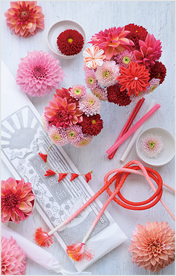 晴れの日にふさわしい贈りものとして、髪飾りをイメージした菊とダリアの花飾りを作りました。