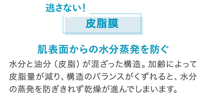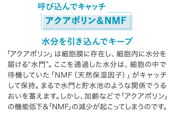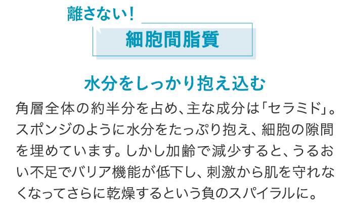 年齢を重ねると、水分と結合する皮脂などの脂質や、角層内の構成成分が減少。さらに、水分を取り込み維持する肌の機能も低下してしまいます。すると、肌がキャッチできなかった「自由水」が増えて「結合水」の量は減少傾向に。化粧水などでうるおいを与えても、一時的にはしっとりするものの、すぐにカサつくという悪循環に陥ってしまうのです。