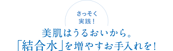 角層内の脂質やアミノ酸と結合して肌に取り込まれた水分。一方、「自由水」は肌の中を自由に移動できる、いわば肌が取り込み損ねた水分です。乾燥した環境で真っ先に蒸散して肌から逃げてしまう「自由水」に対し、「結合水」は、肌ががっちりとホールドしているため肌内に定着し、美肌を支える「うるおいの源」に。みずみずしい肌の決め手となるのです。