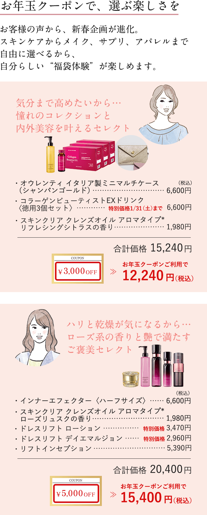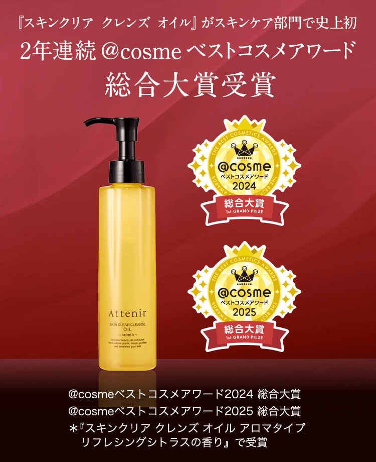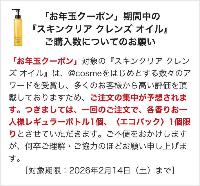 おかげさまで、『スキンクリア クレンズ オイル*』がスキンケア部門で史上初、2年連続@cosmeベストコスメアワード総合大賞を受賞することができました。お客様に感謝の気持ちを込めて、アテニア全商品にお使いいただける「お年玉クーポン」をご用意いたしました。美と健康のサポートに、ぜひお役立てください。