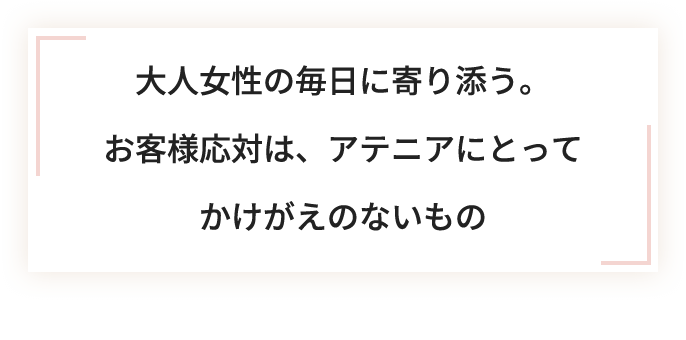 アテニアのオペレーターは、窓口業務でより高みを目指すために、社外の「電話応対コンクール」に挑戦することもあります。毎回、会社を挙げて大々的に応援。「お客様応対は、アテニアにとってかけがえのないもの」と、全社員が再確認するきっかけにもなっています。忙しい大人女性の毎日に寄り添うアテニアの商品には、私自身も助けられています。同じように愛用してくださっている方や、初めて興味を持たれた方にとって、私たちは常に頼れる存在でありたいと思います。ご質問・ご感想、美容や健康に関するご相談まで、ご遠慮なくお問い合わせください!
