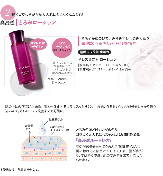 硬くゴワつきがちな大人肌にもぐんぐんなじむ!とろみローション
