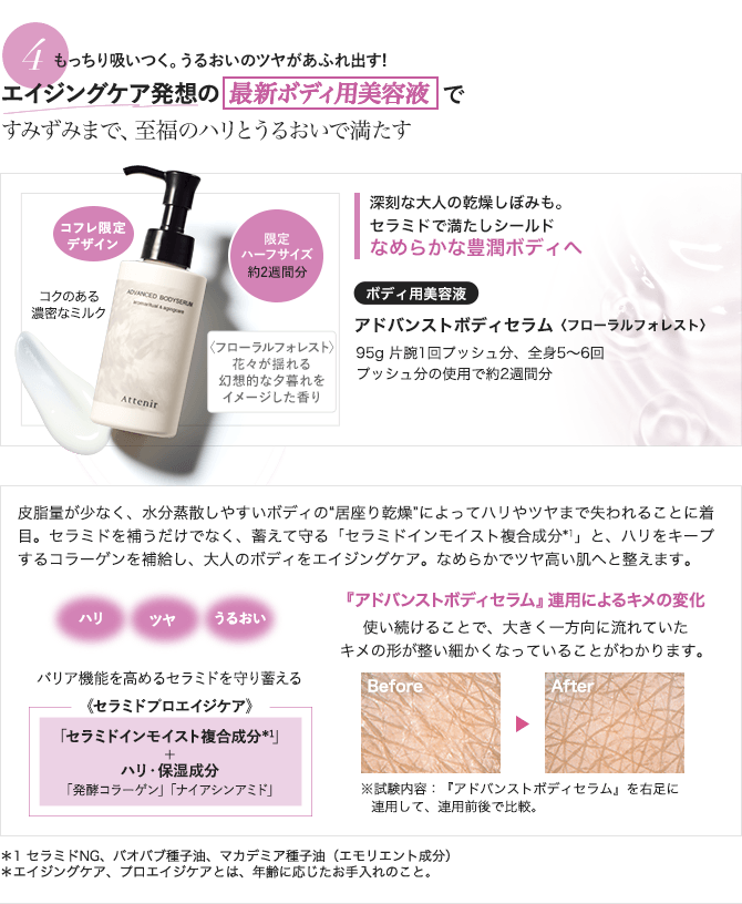 エイジングケア発想の最新ボディ用美容液で すみずみまで、至福のハリとうるおいで満たす