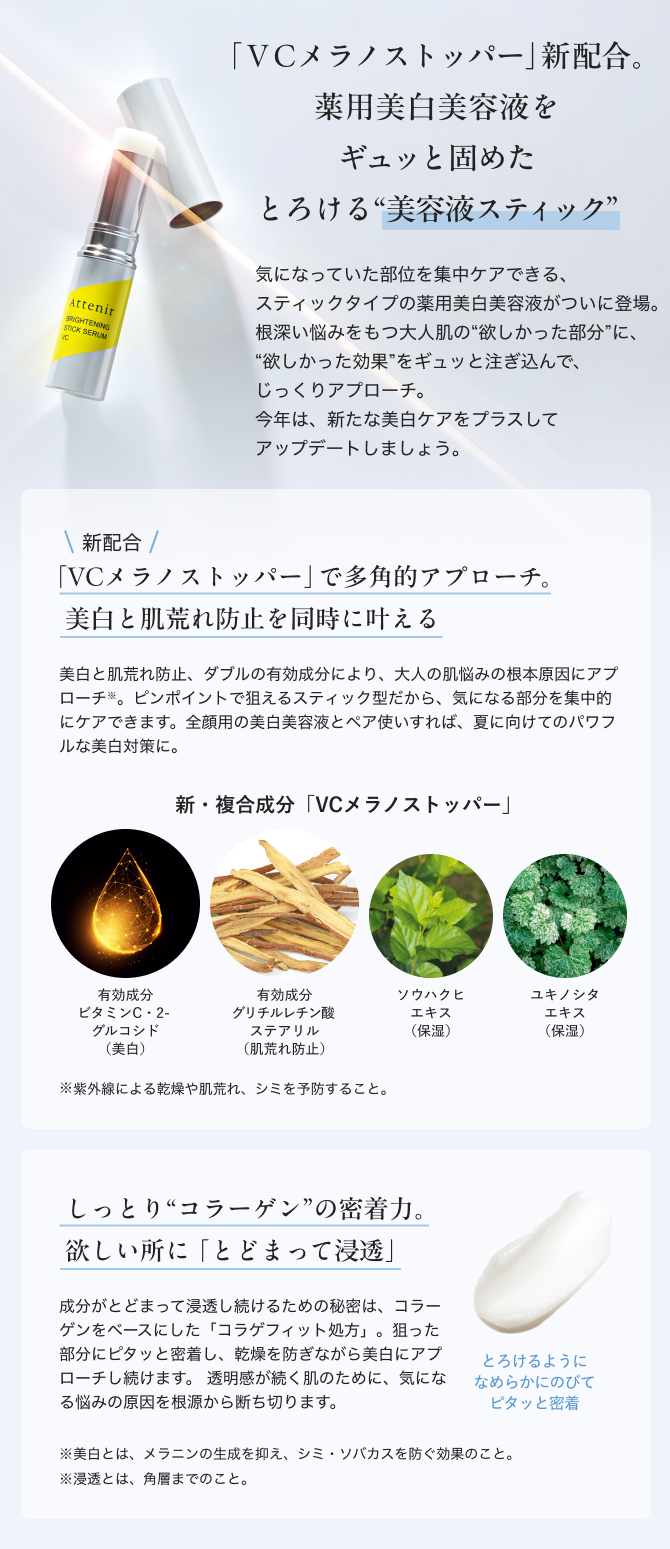 ※販売終了後に、ご注文ハガキ・FAX・インターネット・24時間自動受付でのご注文が到着した場合、「アテニア ポイントプログラム」、「アテニア プラスオン会員特典」、各種キャンペーンの計算からは除かせていただきます。 - \新配合/「VCメラノストッパー」で多角的アプローチ。 美白と肌荒れ防止を同時に叶える