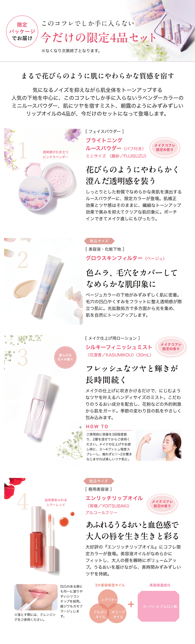 - 気になるノイズを抑えながら肌全体をトーンアップする人気の下地を中心に、このコフレでしか手に入らないラベンダーカラーのミニルースパウダー、肌にツヤを宿すミスト、朝露のようにみずみずしいリップオイルの4品が、今だけのセットになって登場します。