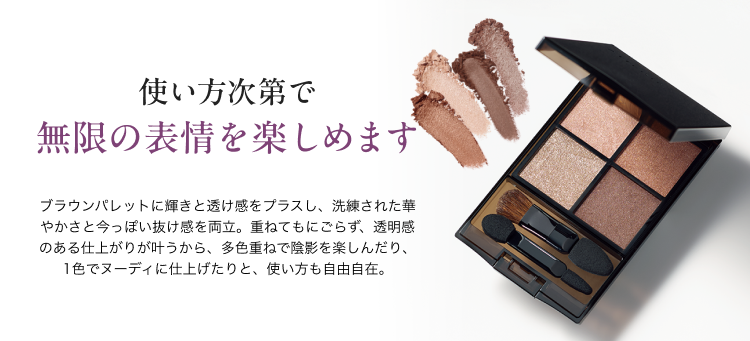 ※販売終了後に、ご注文ハガキ・FAX・インターネット・24時間自動受付でのご注文が到着した場合、「アテニア ポイントプログラム」、「アテニア プラスオン会員特典」、各種キャンペーンの計算からは除かせていただきます。 - ブラウンパレットに輝きと透け感をプラスし、洗練された華やかさと今っぽい抜け感を両立。