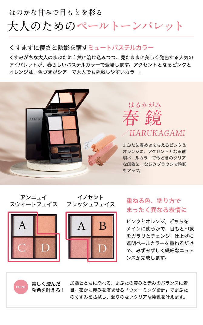 - まぶたに春めきを与えるピンク&オレンジに、アクセントとなる透明ペールカラーで今どきのクリアな印象に。なじみブラウンで陰影もアップ。