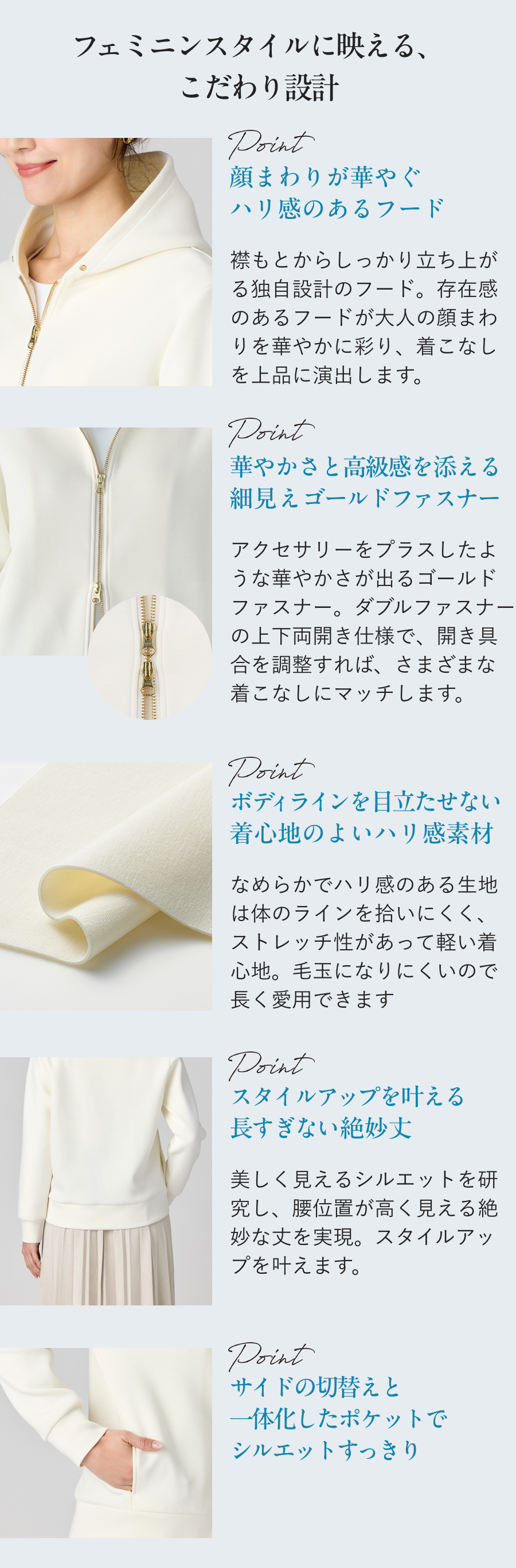 “パーカー=カジュアル”のイメージを一新する、大人をきれいに見せるディテールにこだわった「大人設計パーカー」