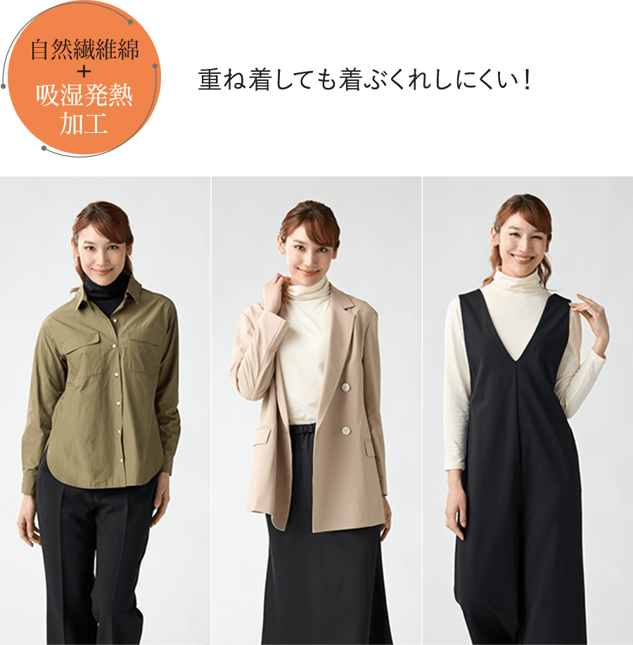 なめらかタッチで着心地抜群!ほどよくフィットするから、着ぶくれしにくくスマートに重ね着も決まるお役立ちインナーです。