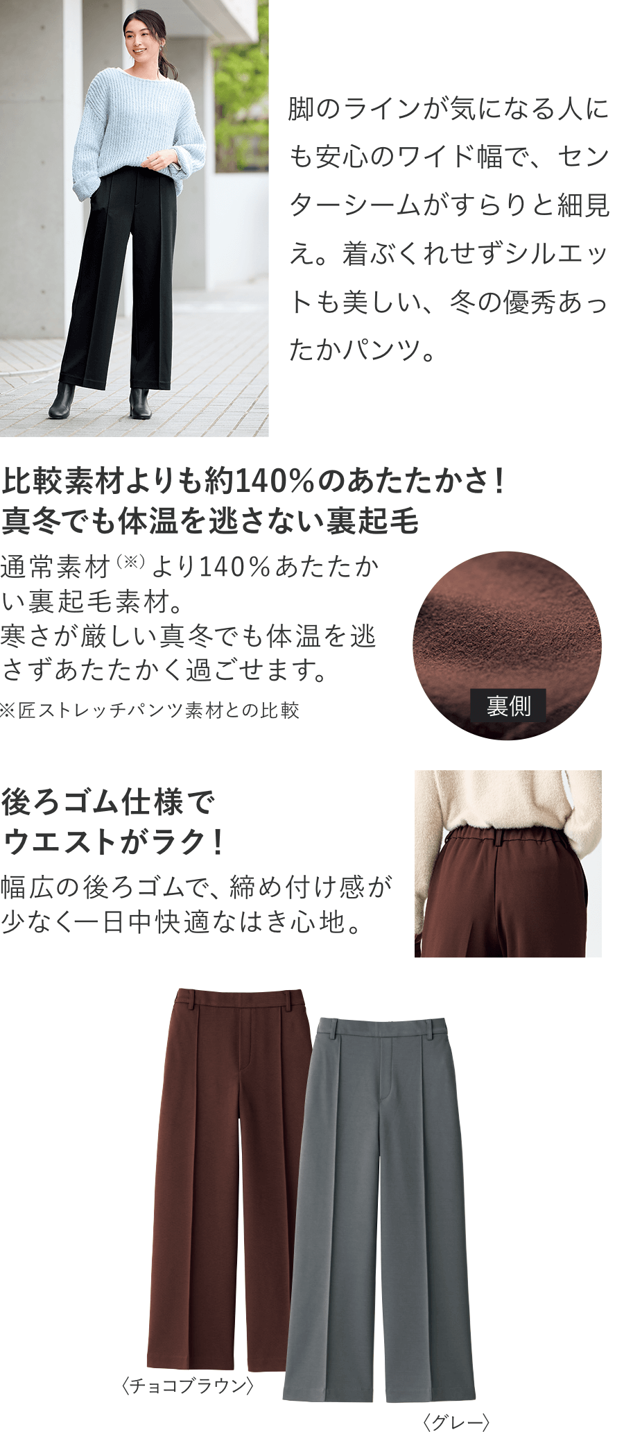 スッキリ見えるのにウエストはゴム仕様のプルオンタイプで楽なはき心地。センターシームはしっかりと縫い付けてある仕様なので、洗濯しても消えず、きちんと感をキープできるのも魅力。