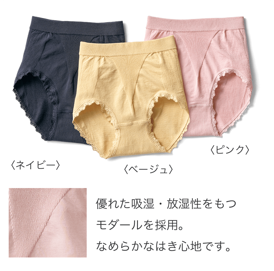汗やムレ、エアコンの冷えからも守ってくれる頼れるショーツ。すっぽり包まれる安心感とソフトなはき心地がうれしい。