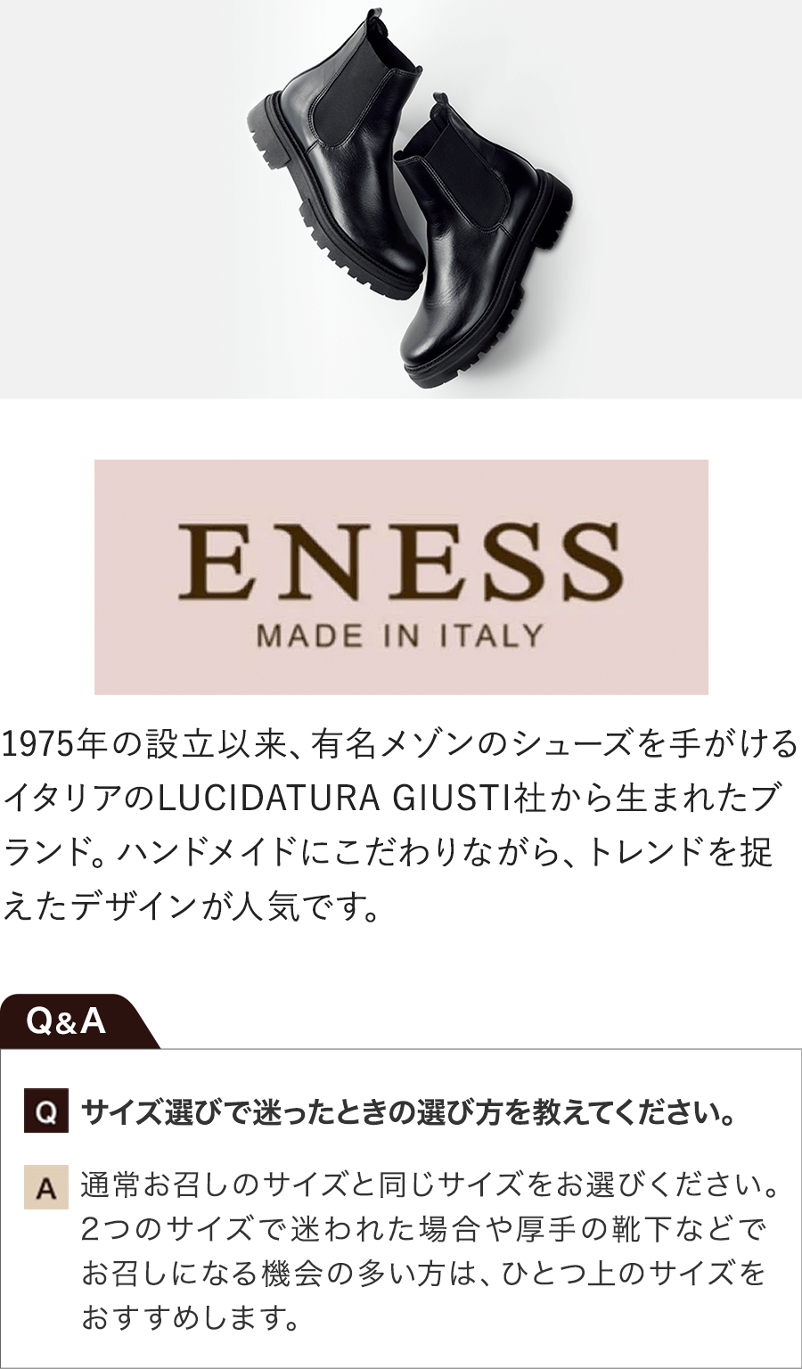 イタリアのブランドENESS(エネス)のサイドゴアブーツ。漆黒に染め上げたカウレザーの独特な艶が美しい上質感漂う洗練ブラック。トレンドの厚底デザインながら履き心地軽やかなのがポイントです。