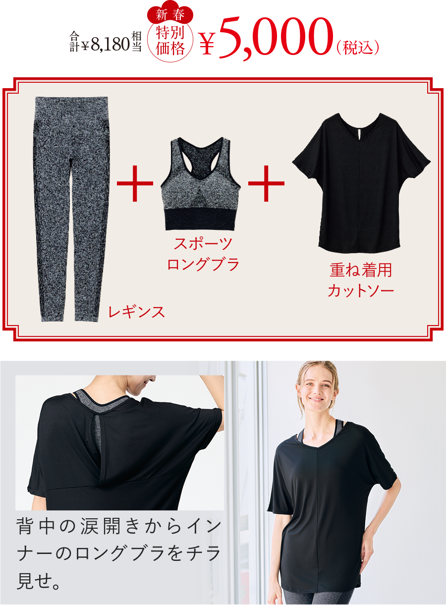 スポーツジムやアクティブシーンが楽しくなるセット。痩せ見え効果のあるブラ&レギンスと、ほどよくボディを隠せるカットソーで新しい一歩を。