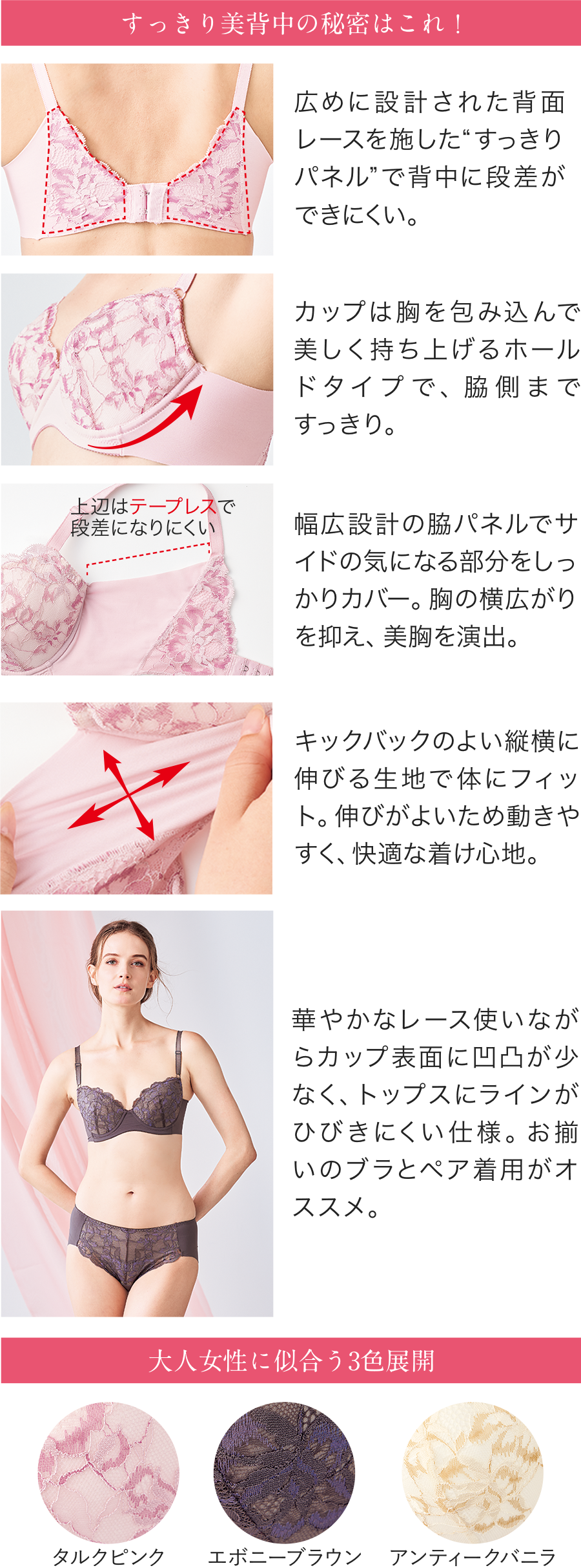 脇から背中にかけて広めのパネル設計でしっかりカバーし、胸だけでなく背中まですっきり美しく演出。華やかなレースが心躍ります。