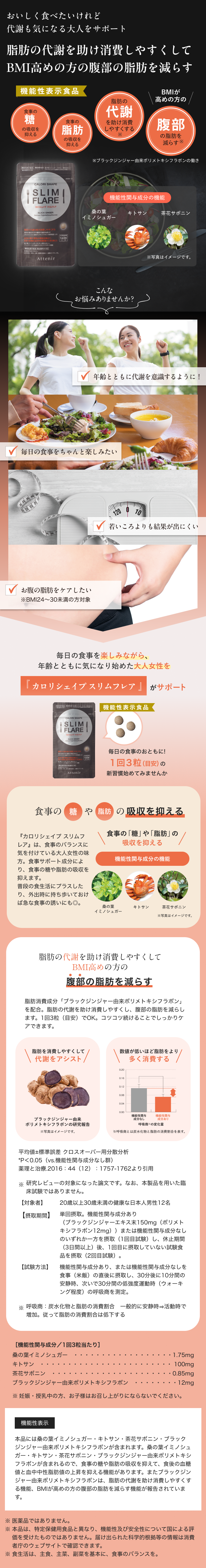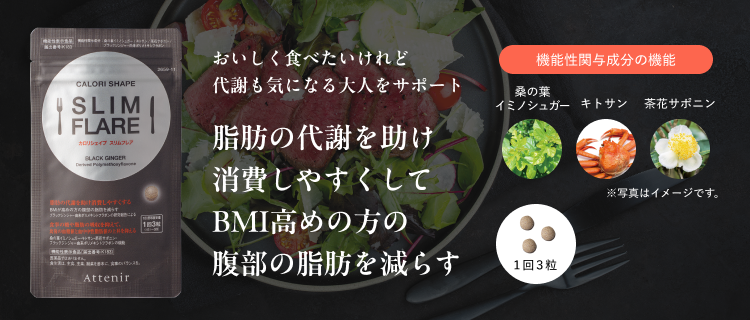 本品には桑の葉イミノシュガー・キトサン・茶花サポニン・ブラックジンジャー由来ポリメトキシフラボンが含まれます。桑の葉イミノシュガー・キトサン・茶花サポニン・ブラックジンジャー由来ポリメトキシフラボンが含まれるので、食事の糖や脂肪の吸収を抑えて、食後の血糖値と血中中性脂肪値の上昇を抑える機能があります。またブラックジンジャー由来ポリメトキシフラボンは、脂肪の代謝を助け消費しやすくする機能、BMIが高めの方の腹部の脂肪を減らす機能が報告されています。
