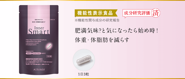 『インナースマート』は、いつどのようにお摂りいただいても問題ございませんが、成分の試験では朝3粒をお召し上がりいただいて機能を確認しています。 - [機能性関与成分/1日3粒当たり]