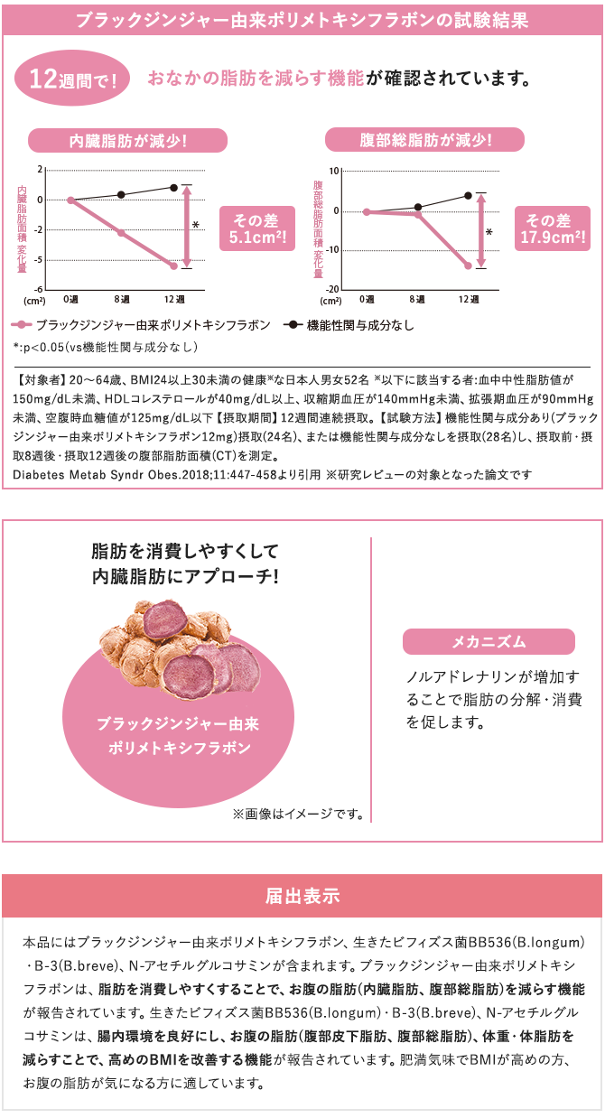 - 本品にはブラックジンジャー由来ポリメトキシフラボン、生きたビフィズス菌BB536(B.longum)・ B-3(B.breve)、N-アセチルグルコサミンが含まれます。ブラックジンジャー由来ポリメトキシフラボンは、脂肪を消費しやすくすることで、お腹の脂肪(内臓脂肪、腹部総脂肪)を減らす機能が報告されています。生きたビフィズス菌BB536(B.longum)・ B-3(B.breve)、N-アセチルグルコサミンは、腸内環境を良好にし、お腹の脂肪(腹部皮下脂肪、腹部総脂肪)、体重・体脂肪を減らすことで、高めのBMIを改善する機能が報告されています。肥満気味でBMIが高めの方、お腹の脂肪が気になる方に適しています。
