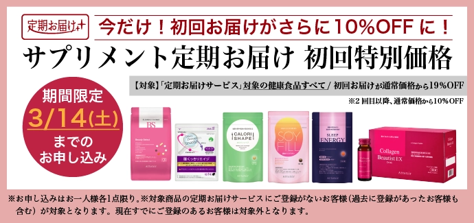 - ・定期お届け初回10%OFFは、こちらのページの対象商品の定期お届けにご登録がないお客様(過去に登録があったお客様も含む)が対象となります。現在ご登録のある方は対象外となります。また、お一人様各1点1回限りとなりますので、ご了承ください。