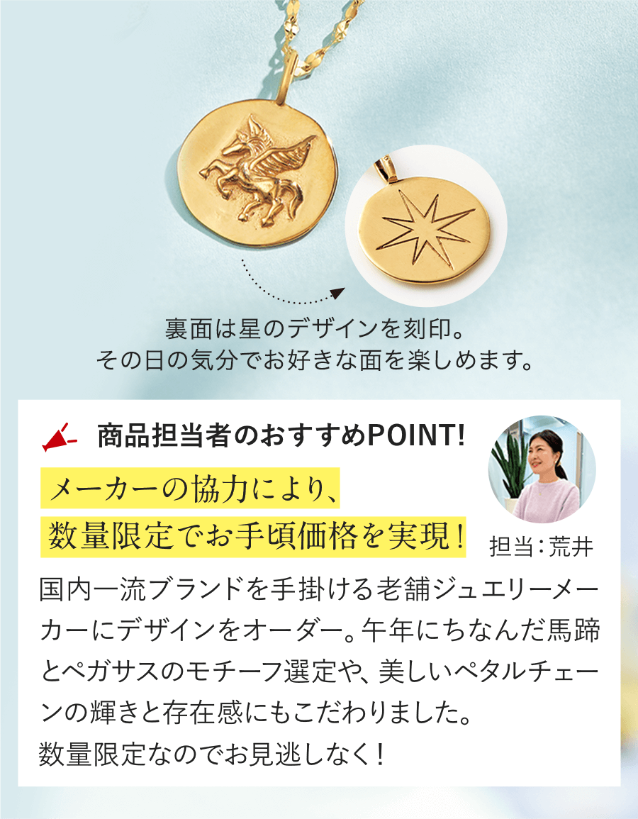 自由や飛躍の象徴“ペガサス”を繊細に表現。2WAYで楽しめるコインネックレス。
