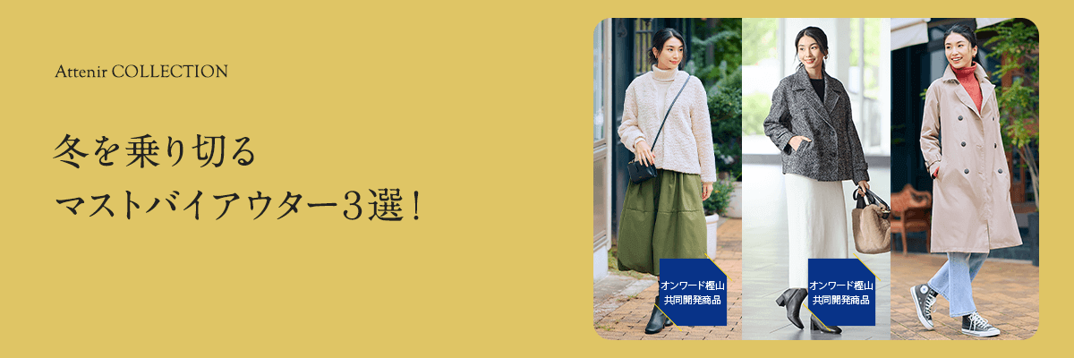 今風スタイルアップが叶うトレンドのショートコートや、雨の日も安心の撥水加工を施した生地の蓄熱ライナー付トレンチコートは、すべてアテニアオリジナル。